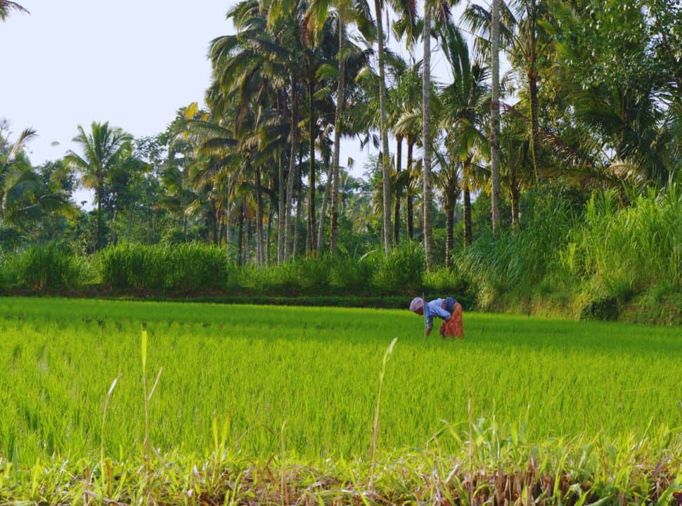 lush green rice terrace at gunung kawi temple Bali, surrounded by palm trees and banana trees