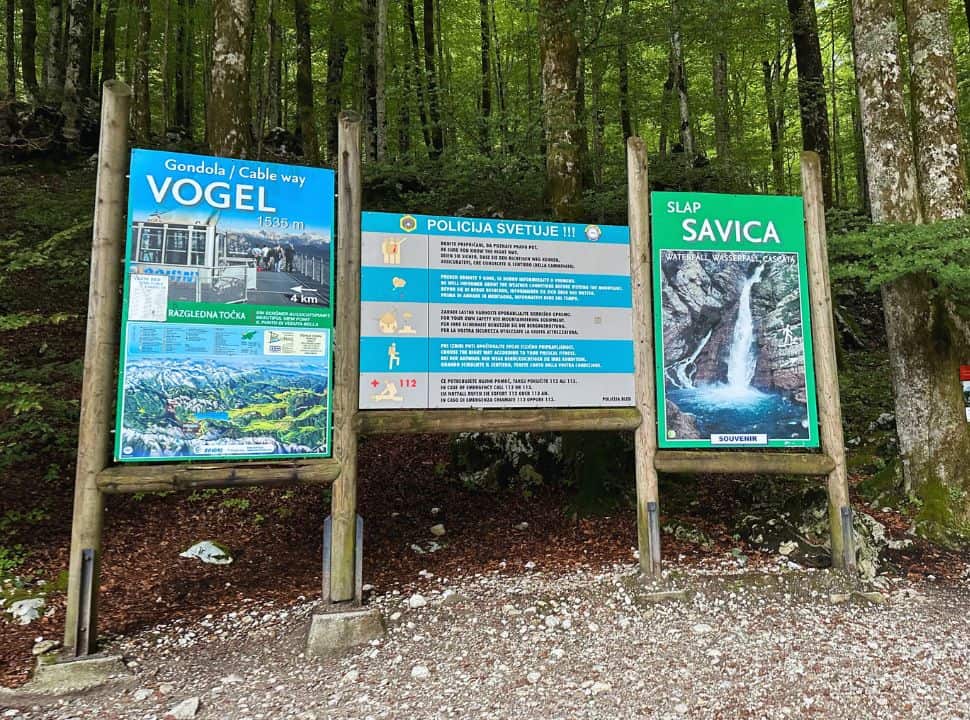 signpost pointing hikers to sum waterfall, and the entrance of Vintgar Gorge near lake Bled Slovenia.