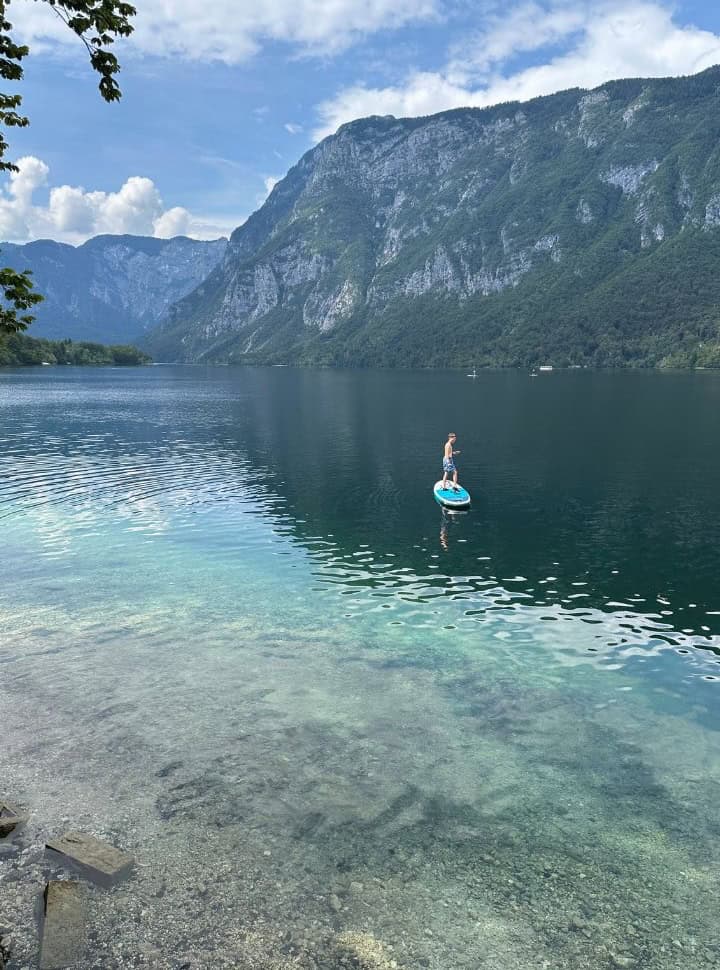 During our trip, we spent a few days near Lake Bohinj, and it quickly became one of our favorite places in Slovenia. Even in high season, the area felt calm and unspoiled, without the crowds we’d seen elsewhere. The peaceful atmosphere made it perfect for slowly SUP-ping across the lake and exploring its corners at an relaxing pace.